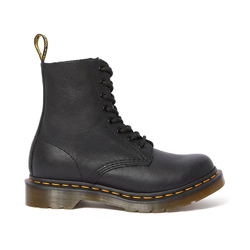 All the history and tough-girl durability of the original, iconic 8-eye Boot—offered in a variety of colors. This Pascal was constructed on our iconic Dr. Martens AirWair bouncing sole. The women's 8-eye boot is Goodyear welted and made with Virginia, a soft, fine grained Nappa leather.