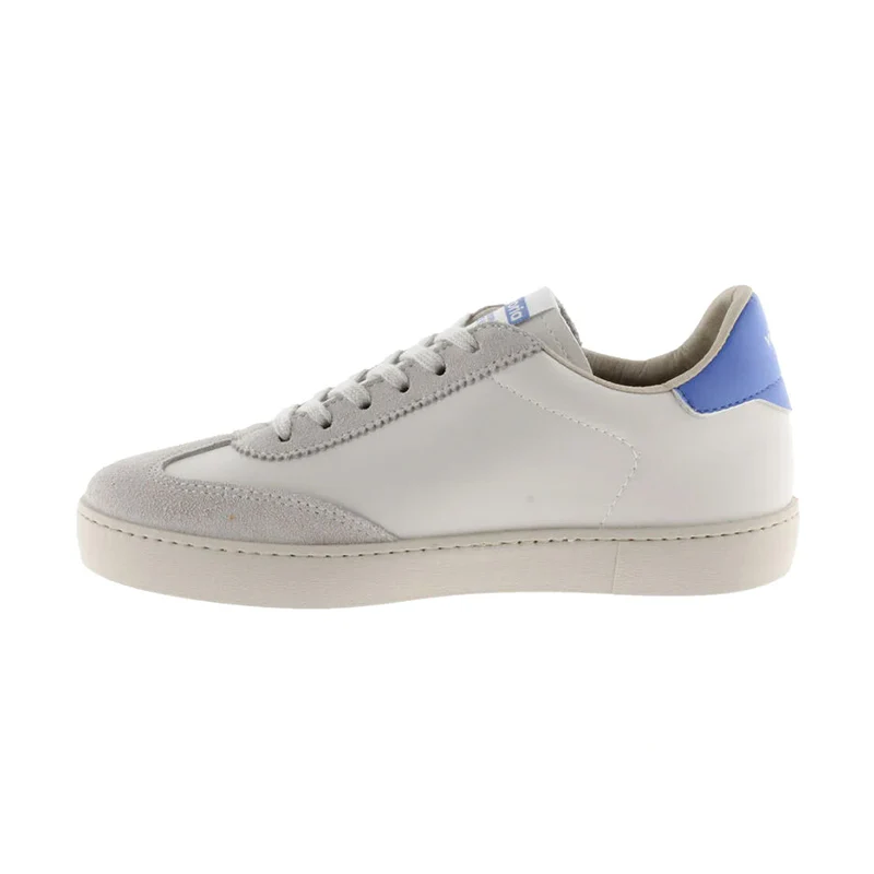White trainers made in Spain in faux leather and split leather panels. Colour details on the V on the side and back and new cyclist cut at the toe, for added style. Light brown sole made with vegetable oils rather than mineral oils, true to our commitment to the environment. Every pair of shoes also features a more ergonomic insole made from recycled materials.